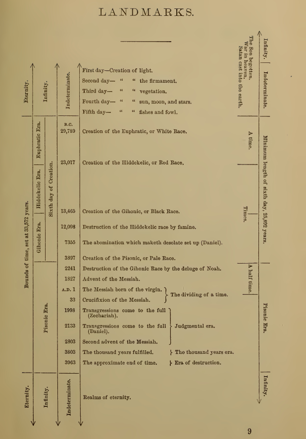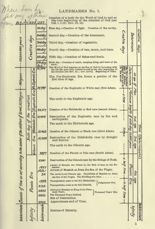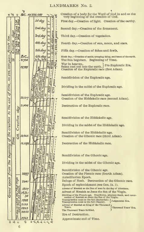 LANDMARKS. They embody the chronology of the Indications, and give the chief divisions of the grand epoch from the beginning of the creation of God down to the end of time (see Ex. xviii. 13-26), together with the approximate dates of some of the more remarkable events in the world's history. By the diagrams a numeral system, that is general throughout the Scriptures, is well set forth, whereby the numbers used in the Scriptures become adjuncts in the location and classification of history from the beginning of the Creative Era down to the end of time. In the accompanying pages of Landmarks, the values of the Judgmental Era and of the Era of Destruction vary slightly from those already published. This difference is due to the slight variations in values of the generation of Christ the Messiah in his personality as Jesus the Son of the Virgin; in that by St. Luke, and by the Book of the Revelation of St. John the Divine, the value approximates thirty-three years and six months, while by the Book of Numbers it approximates thirty-three years and nine months. Wherefore the latter has been incorporated as a factor in the general chronology. Mosaic System, as being the more harmonious for long periods of time. The years of the six creative days are derived from an historical ray running through the Book of Judges; but, although strongly indicated, they cannot be accepted as established until supported by one or more independent lines of chronology covering the same epochs; yet the total years of these periods have been approximated, and thereby substantiated, from numerous scriptural allegories otherwise given. That is supported by the elucidation of the Great Pyramid and the Codex Argenteus, thus bringing to notice, further witnesses. In Landmarks No. 2, space a, a indicates the Grand Epoch from the beginning of the creation to the end of time; b, b' indicate time; b', b" indicate the creative days; c, c indicate the Grand Epoch as days; d, d indicate general chronology of the Grand Epoch; e, e indicate pertaining of the four rivers of Eden to the Four Ages of Man; f, f indicate the Four Ages of Man; g, g indicate the Four Ages of Man by the first four seals of the vision of St. John the Divine (see Rev. vi. 1-8); h, h indicate four independent, consecutive creations of men of Adam's race, Adam being the generic name of each race (see Gen. v. 1, 2); i, i indicate the twenty divisions of the Grand Epoch as a single ray running through it; j, j indicate chronology of the Grand Epoch through the male line, — that is, as including overlaps; k, k indicate chronology of the Grand Epoch through the female line, — that is, from year to year as independent of overlaps. //∞\\ |